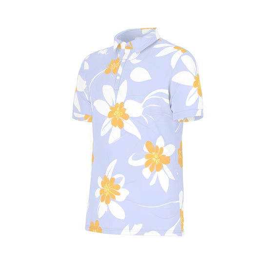 White flowers with light blue background Stretch Polo Shirt -